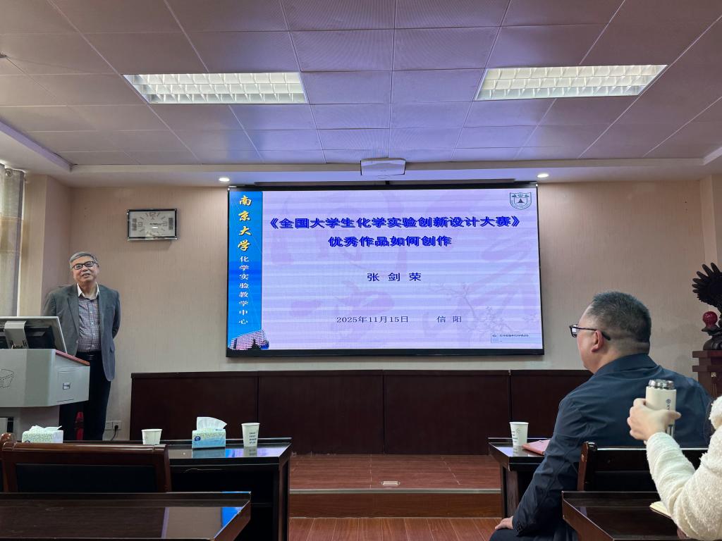 张剑荣教授以“《全国大学生化学实验创新设计大赛》优秀作品如何创作”为题展开分享。报告中,张剑荣教授结合全国大学生化学实验创新设计大赛竞赛评审经验,从第五届大赛基本情况、竞赛赛道和作品要求,以及往届作品在选题、设计、实施中存在的主要问题三大维度,进行了系统深入的解析。他通过典型案例对比,清晰指明了优秀作品的创作逻辑与提升路径,为学院师生备战后续赛事提供了针对性指导。