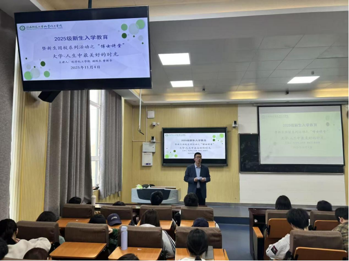 11月4日,化学化工学院在教四T2开展2025级新生入学教育暨新生团校系列活动之“博士讲堂”,化学化工学院副院长曹新华主讲,学院团委书记赵方方主持,2025级全体新生共同参与。