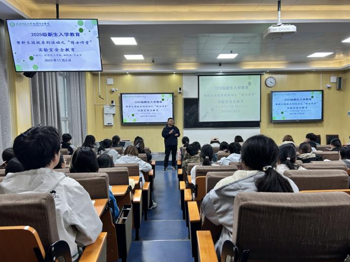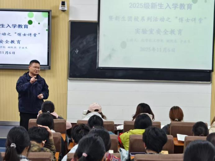 化学化工学院2025级新生入学教育暨新生团校系列活动之“博士讲堂”第二讲于11月6日在教四楼T2教室开讲。本次讲座由学院副院长于永生主讲,以实验室安全为核心,为全体2025级新生带来了一堂深刻而实用的专业思想教育课。