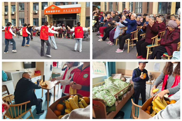 活动在欢快的氛围中拉开帷幕。化学化工学院文体部舞蹈队带来了一支活力四射的《桃花朵朵开》,轻快的节奏与灵动的舞姿赢得了爷爷奶奶们的阵阵掌声,他们脸上绽放的笑容,成为现场最动人的风景。随后,杨洁同学深情领唱《明天会更好》,温柔的歌声承载着对未来的美好祝愿,不少老人情不自禁地跟随旋律轻声哼唱,将温暖氛围推向高潮。志愿者们带领大家一同参与《七彩阳光》活动操,现场气氛轻松而愉悦,处处洋溢着青春与活力的气息。在随后的“防诈+健康”主题宣讲环节,范晓淇同学以通俗易懂的语言,耐心讲解老年人日常生活中可能遇到的问题,字里行间流淌着浓浓的关切与温情。互动环节,舞蹈队跳起《桃花朵朵开》,老人们跟随节奏摆动双手,音乐与笑声交织,谱写出一段温暖而难忘的乐章。活动尾声,全体人员合影留念,定格下这温馨时刻。随后大家分组前往老人宿舍,并送上学院提前准备的新鲜应季水果,为长辈送上化学化工学院的暖心祝福。