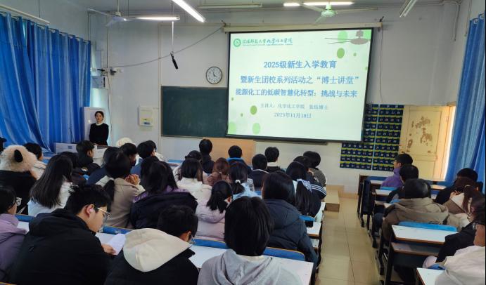 11月18日,化学化工学院在教九楼301教室开展2025级新生入学教育暨新生团校系列活动之“博士讲堂”,化学化工学院张钰博士主讲,学院团委书记赵方方主持,2025级应用化学、材料化学专业新生参与。