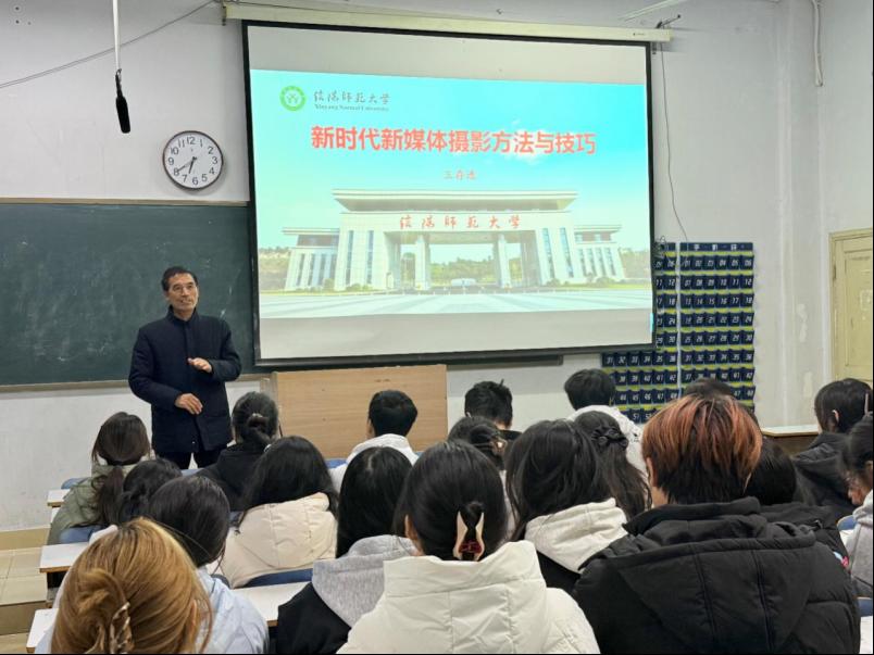 讲座中,王存选围绕“摄影构图、画面布局的章法、拍摄角度与画面形象”三大核心板块展开系统讲解。他先结合校园风景、活动现场等案例,细致拆解了摄影构图的基础技巧,随后将重点落在“画面布局的章法”板块,他特别强调,画面布局是决定作品“是否有故事感”的关键:既要明确“突出主体”,也要注重主体与陪衬的情节构建,同时还要善用前景与背景的层次运用,让画面更具空间感与校园特色。最后,王存选鼓励同学们勇于尝试,勤于练习,拿起镜头记录大学生活的美好瞬间。