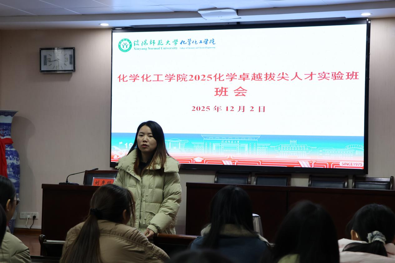 12月2日,信阳师范大学化学化工学院2025级化学拔尖人才实验班第一次班会顺利召开。班主任万榕主持会议,实验班全体学员参会,共同为班级建设与成长规划奠定基础。