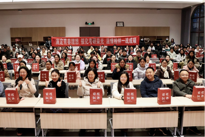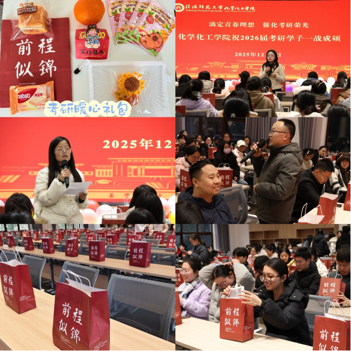 学院还为每位考研学子精心准备了“前程似锦”的暖心礼包,代表学院对大家最诚挚的祝福与期盼,包括“向日葵”(一举夺魁)、“橙子”(心想事成)、“考试笔袋”(妙笔生花)、“暖贴”(温暖相伴)、“面包饼干”(能量满满)和学弟学妹们亲手绘制的贺卡等多种充满寓意的礼物,将最美好的祝愿融入考试全程,为考研征途增添一份温暖与力量。最后,师生共同喊出“滴定青春理想,催化考研荣光,让我们一战成硕”的口号,传递出学子们昂扬向上的备考斗志与勇毅前行的奋进决心。