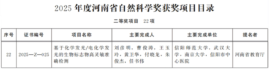 信阳师范大学化学化工学院刘彦明教授、曹俊涛教授团队的“基于化学发光/电化学发光的生物标志物高灵敏准确检测”项目荣获河南省自然科学奖二等奖。该项目聚焦化学发光/电化学发光(CL/ECL)在检测复杂生物样品中低丰度生物标志物时存在的灵敏度低和准确度差等关键科学问题,通过系统深入研究,揭示了从单因素信号增强到多因素信号协同增强的耦合机制及其对信号的调控规律,发展了系列灵敏度高、选择性好的CL/ECL检测新方法,创新性地提出了“分子识别—信号转导—灵敏检测”新模式,成功实现了人体液中低丰度标志物及单细胞水平靶标分子的灵敏准确检测。相关研究成果为重大疾病的早期诊断与精准医疗提供了重要的理论依据和技术支撑。